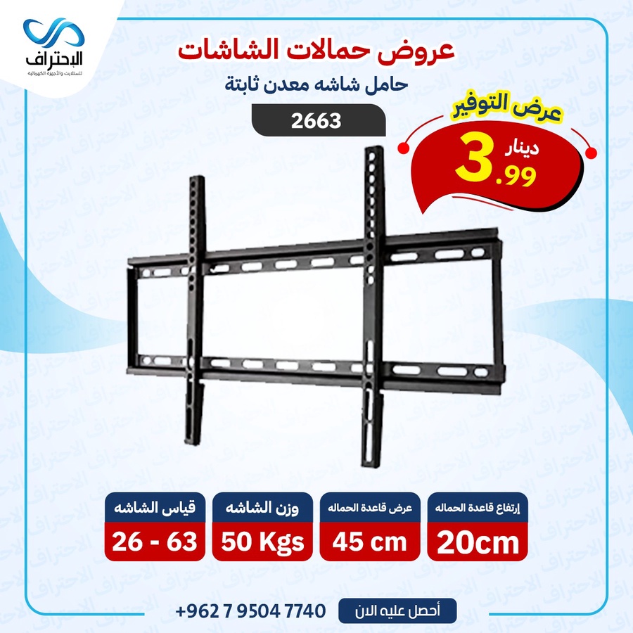 حامل شاشة جداري ثابت 2663 مناسب لشاشات 26 إلى 63 إنش، يتحمل حتى 50 كغم، بتصميم معدني قوي وثبات ممتاز للاستخدام اليومي.