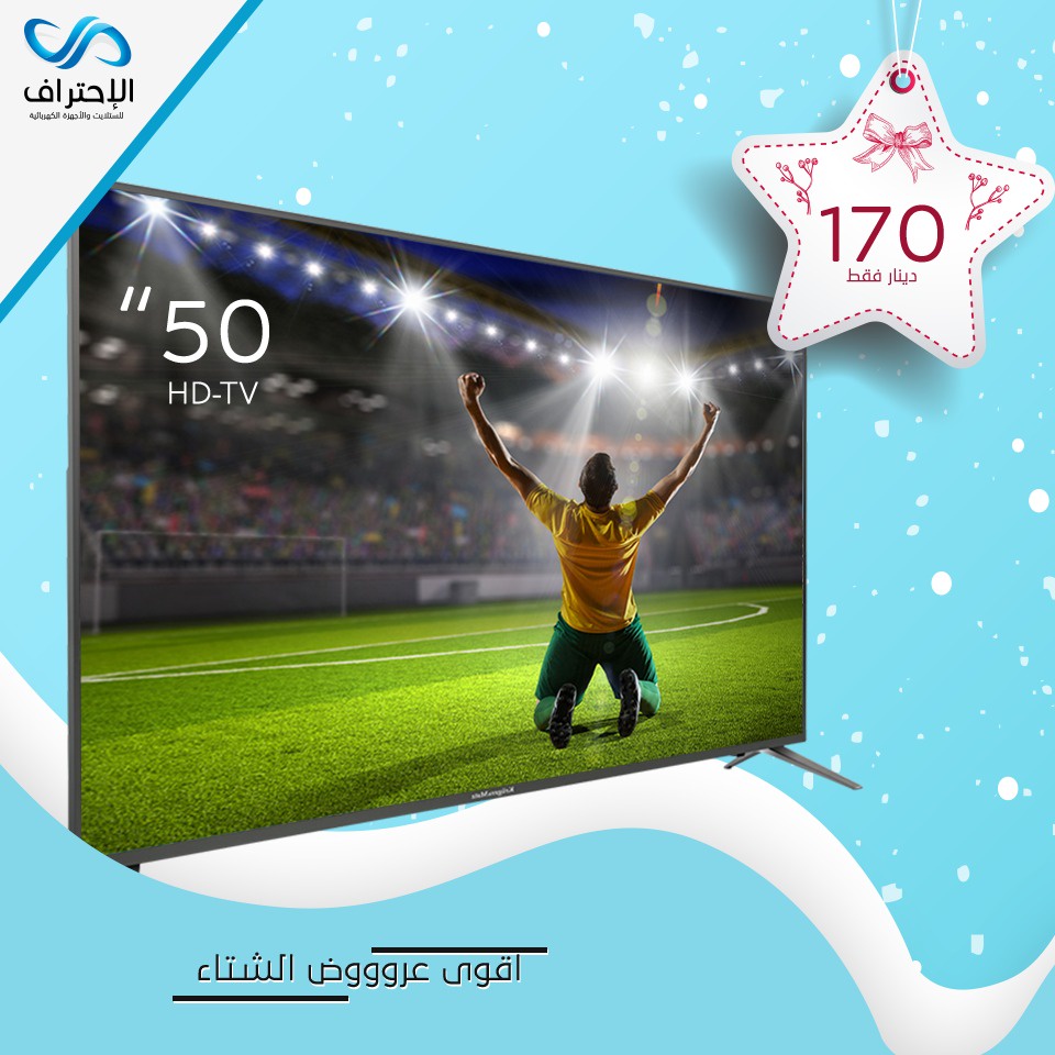 شاشة 50 إنش HD بتصميم عصري وحجم كبير يمنحك مشاهدة أوضح وتجربة مريحة للأفلام والقنوات والمباريات، بسعر مناسب ومميز.