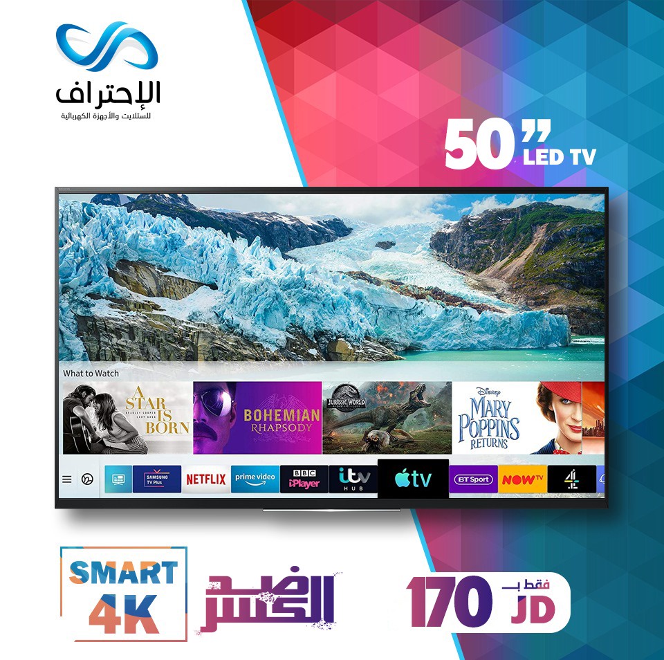 تلفزيون سمارت 50 بوصة بدقة 4K مع جودة عرض عالية وميزة مقاومة الكسر، مناسب للمنزل والمجالس وتجربة مشاهدة ممتعة بسعر 170 دينار فقط.