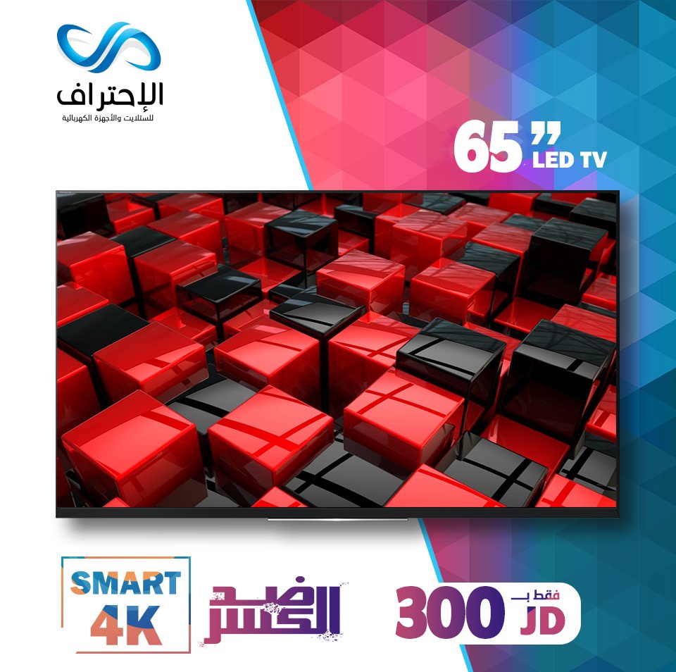 تلفزيون سمارت 65 بوصة بدقة 4K وجودة عرض ممتازة مع ميزة مقاومة الكسر، مناسب للمساحات الكبيرة وتجربة مشاهدة قوية بسعر 300 دينار فقط.