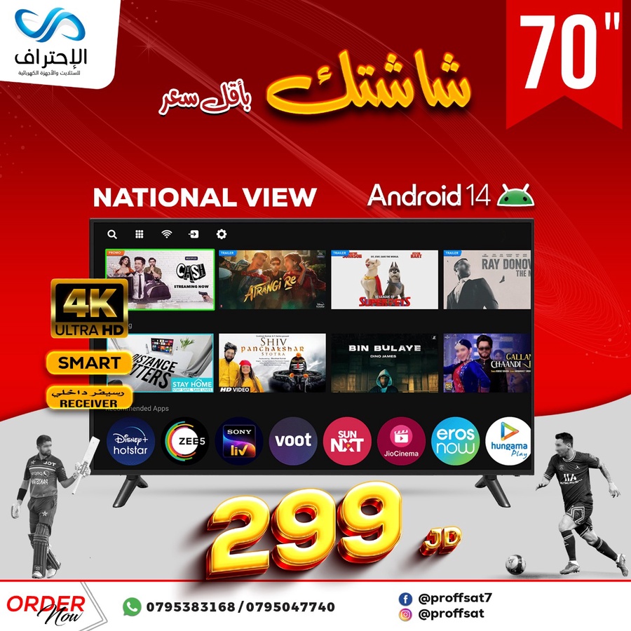 إذا بدك حجم أكبر وتجربة سينمائية أقوى، شاشة 70 بوصة من National View هي الخيار المناسب! أداء قوي، صورة ضخمة، ونظام ذكي حديث يعطيك كل شي بمكان واحد.