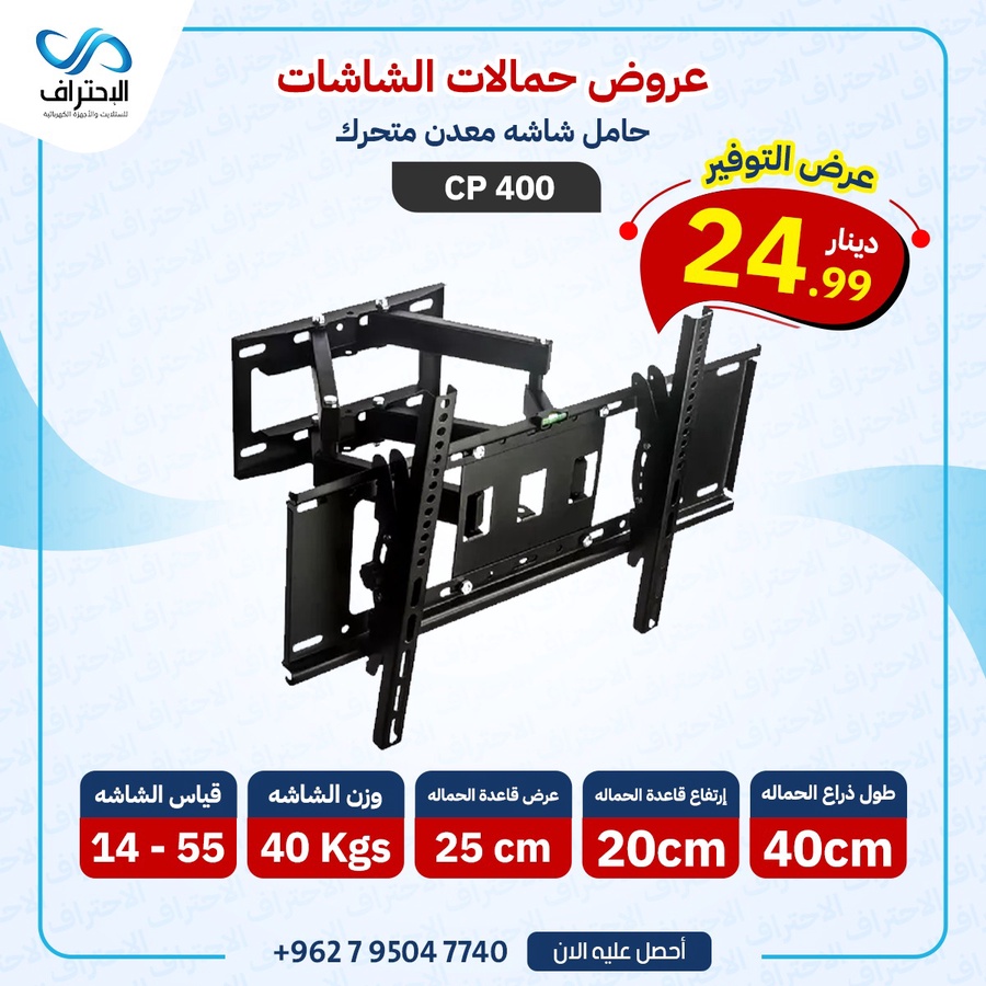 حامل شاشة جداري متحرك CP 400 مناسب لشاشات 14 إلى 55 إنش، يتحمل حتى 40 كغم، مع ذراع 40 سم وثبات قوي ومرونة ممتازة.