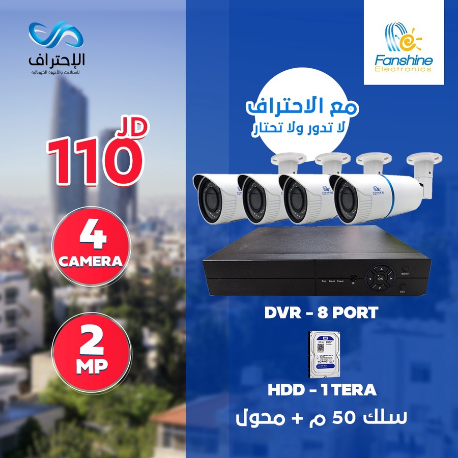 طقم كاميرات مراقبة Fanshine يضم 4 كاميرات 2MP مع DVR 8 منافذ وهارد 1 تيرا، بالإضافة إلى 50 متر سلك ومحول، لمراقبة أوضح وأداء عملي.