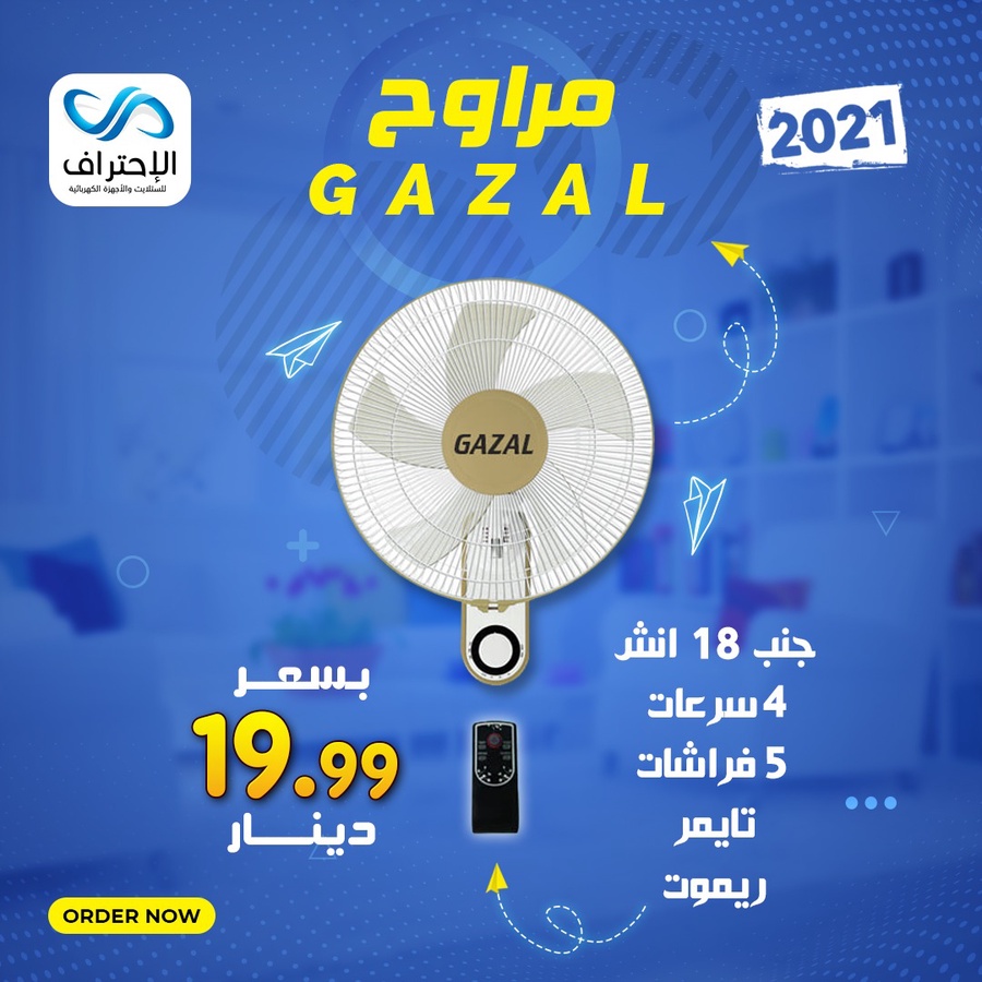 مروحة غزال جدارية 18 إنش مع ريموت، 4 سرعات و5 شفرات وتايمر، تصميم عملي يوفر تهوية قوية ومناسبة للمنزل والمكتب.