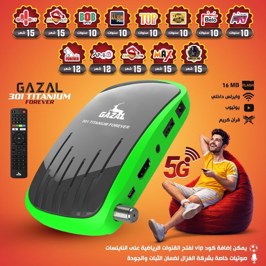 رسيفر Gazal 301 Titanium Forever 5G بلون أخضر مميز وتصميم عصري، يدعم وايرلس داخلي ويوتيوب وقرآن كريم، مع ذاكرة 16 MB Flash ومظهر عملي للاستخدام اليومي.