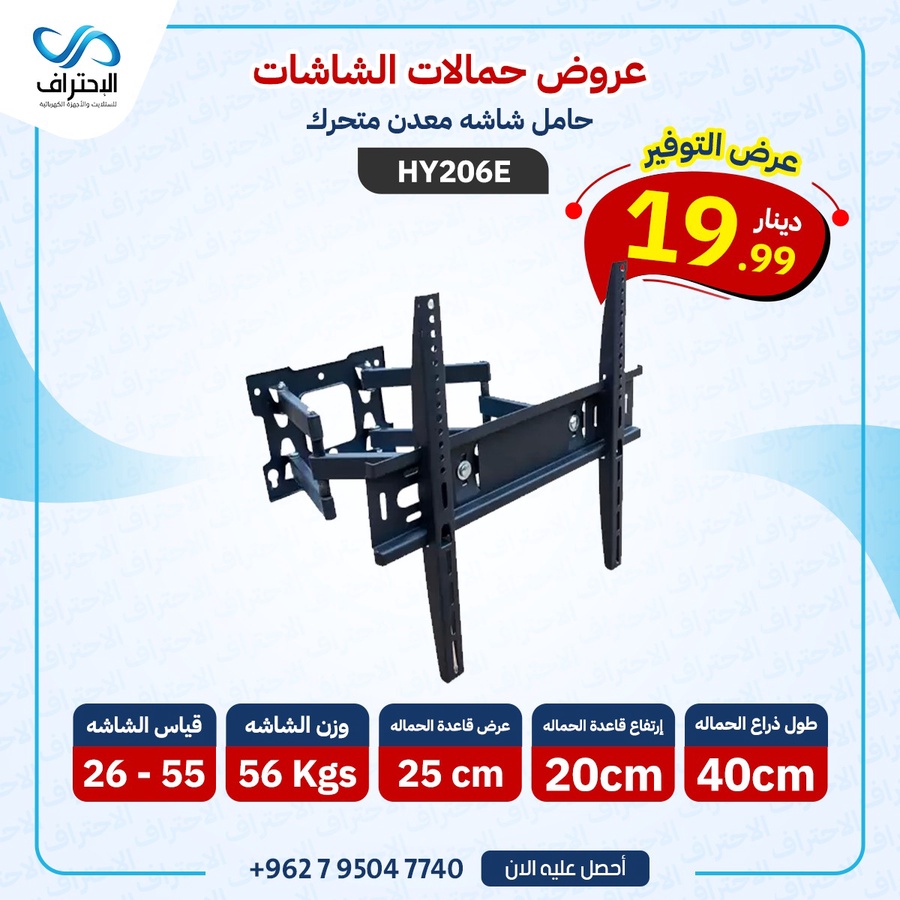يدعم هذا الحامل الشاشات بمقاس 26 إلى 55 إنش، ويتحمل وزن يصل إلى 56 كغم، ما يمنحه قوة تحمل عالية وثباتًا ممتازًا. كما يأتي بذراع بطول 40 سم، مع قاعدة تثبيت بارتفاع 20 سم وعرض 25 سم، ليجمع بين المرونة والقوة في نفس الوقت.
