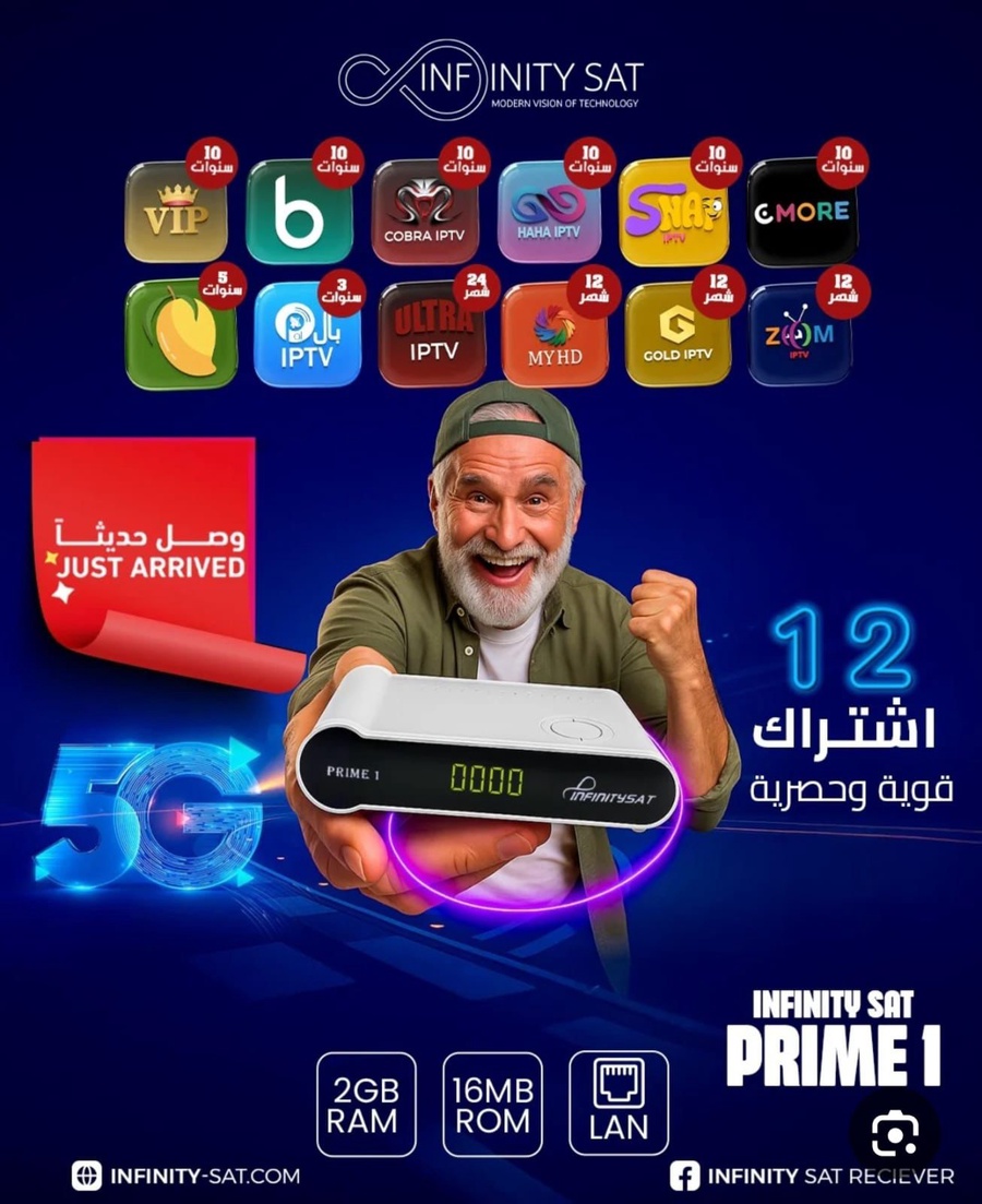 رسيفر Infinity Sat Prime 1 مع 12 اشتراك قوي وحصري، يدعم 5G ويأتي بذاكرة 2GB RAM و16MB ROM ومنفذ LAN لتجربة ترفيه منزلية قوية وعملية.