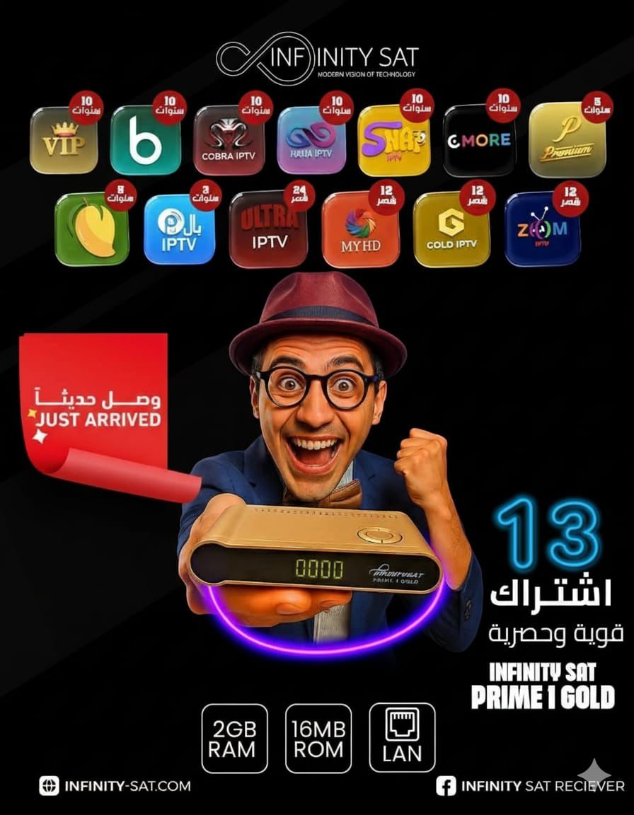 رسيفر Infinity Sat Prime 1 Gold مع 13 اشتراك قوي وحصري، ذاكرة 2GB RAM و16MB ROM ومنفذ LAN، مناسب لتجربة ترفيه منزلية قوية ومتنوعة.