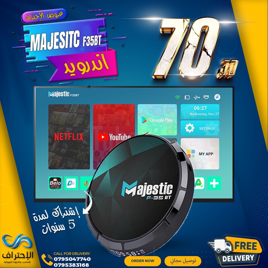 جهاز Majestic F35BT أندرويد TV Box مع اشتراك لمدة 5 سنوات وتوصيل مجاني، يمنحك تجربة ترفيه ذكية وعملية بسعر مميز 70 دينار فقط.