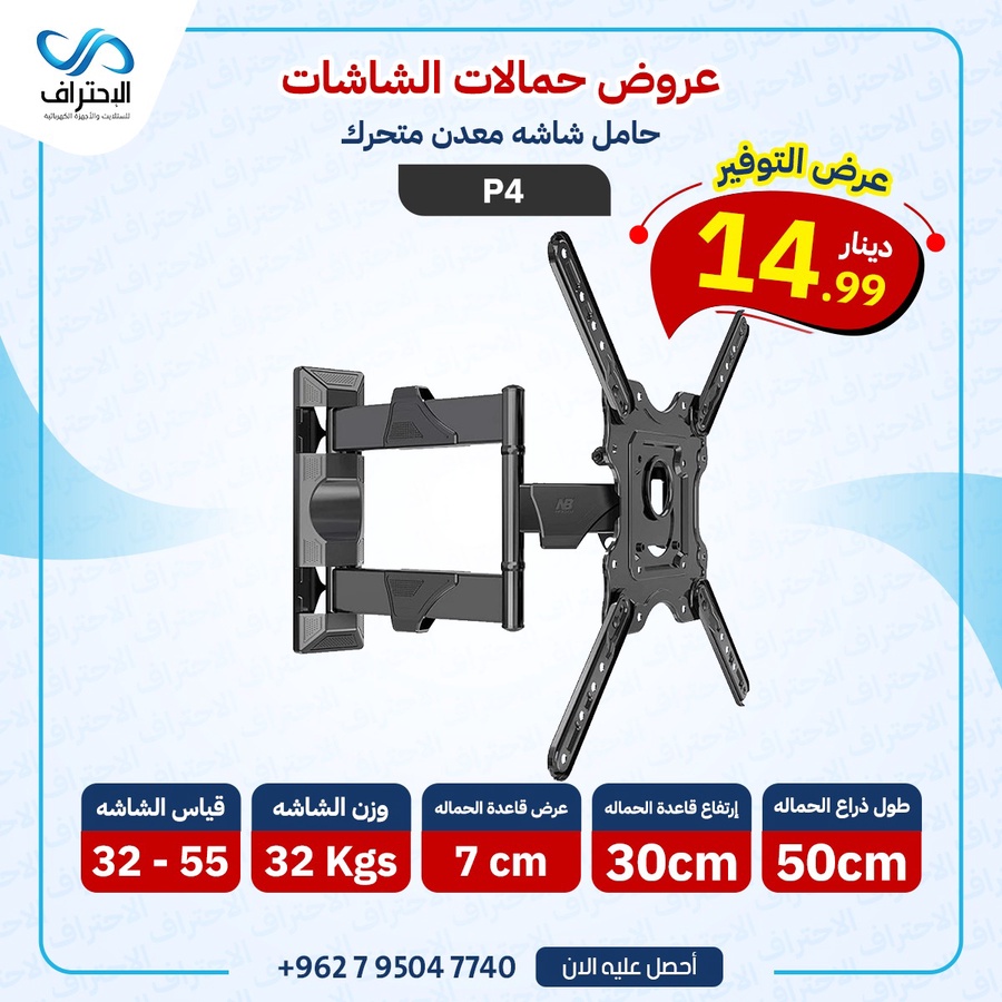 حامل شاشة جداري متحرك P4 مناسب لشاشات 32 إلى 55 إنش، يتحمل حتى 32 كغم، مع ذراع 50 سم لمرونة عالية وثبات ممتاز.