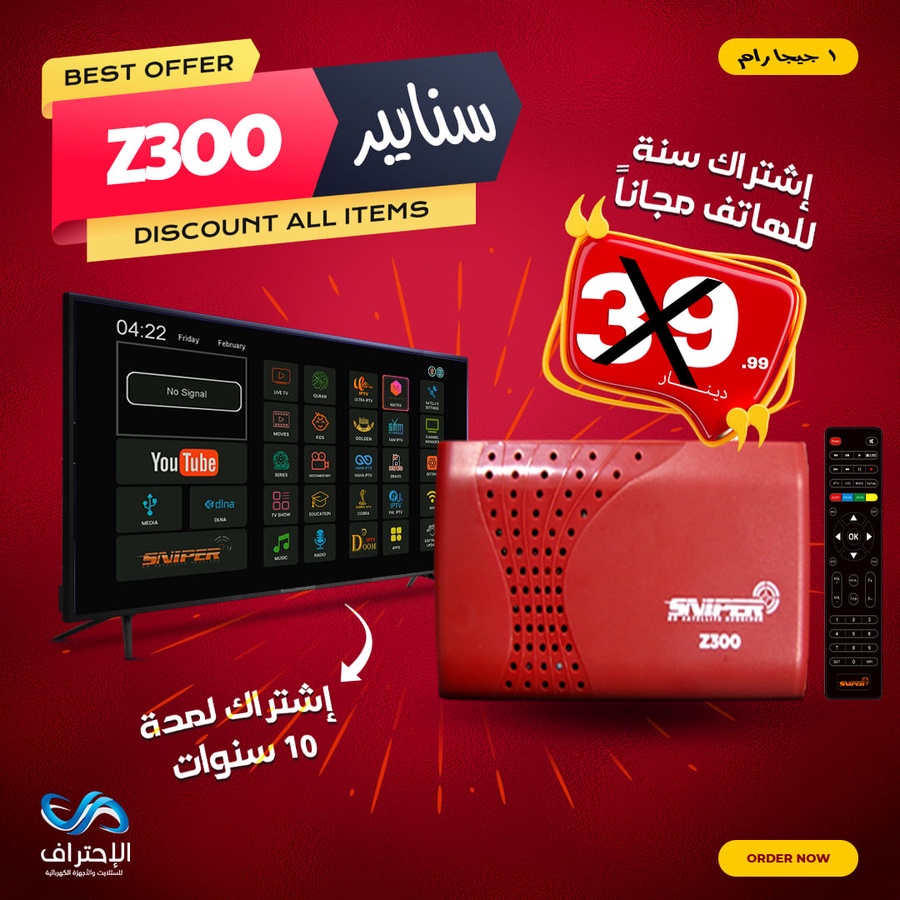 يأتي Sniper Z300 بتصميم أنيق وحجم مناسب، مع ريموت كنترول لسهولة التحكم والاستخدام. كما أن الإعلان يوضح أن الجهاز مناسب للاقتناء لفترة طويلة، مع عرض تسويقي قوي ومميز.