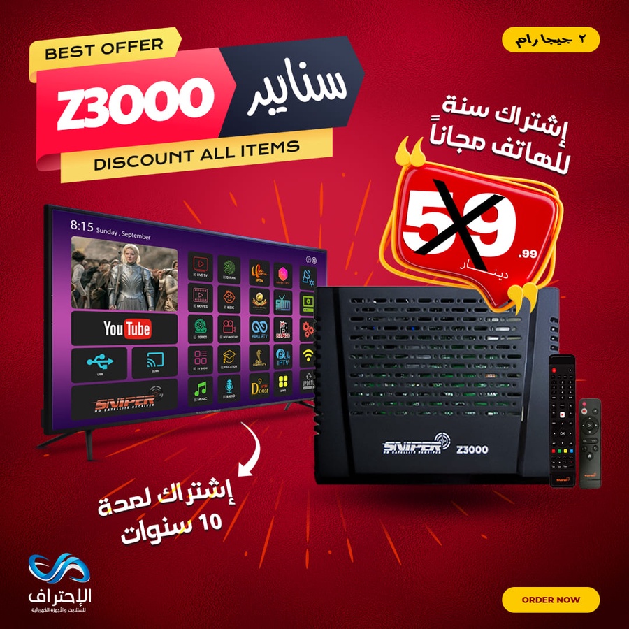 رسيفر Sniper Z3000 بتصميم عصري وأداء عملي، مع عرض مميز يشمل اشتراك سنة للهاتف مجاناً، مناسب للاستخدام المنزلي وتجربة ترفيه أفضل.