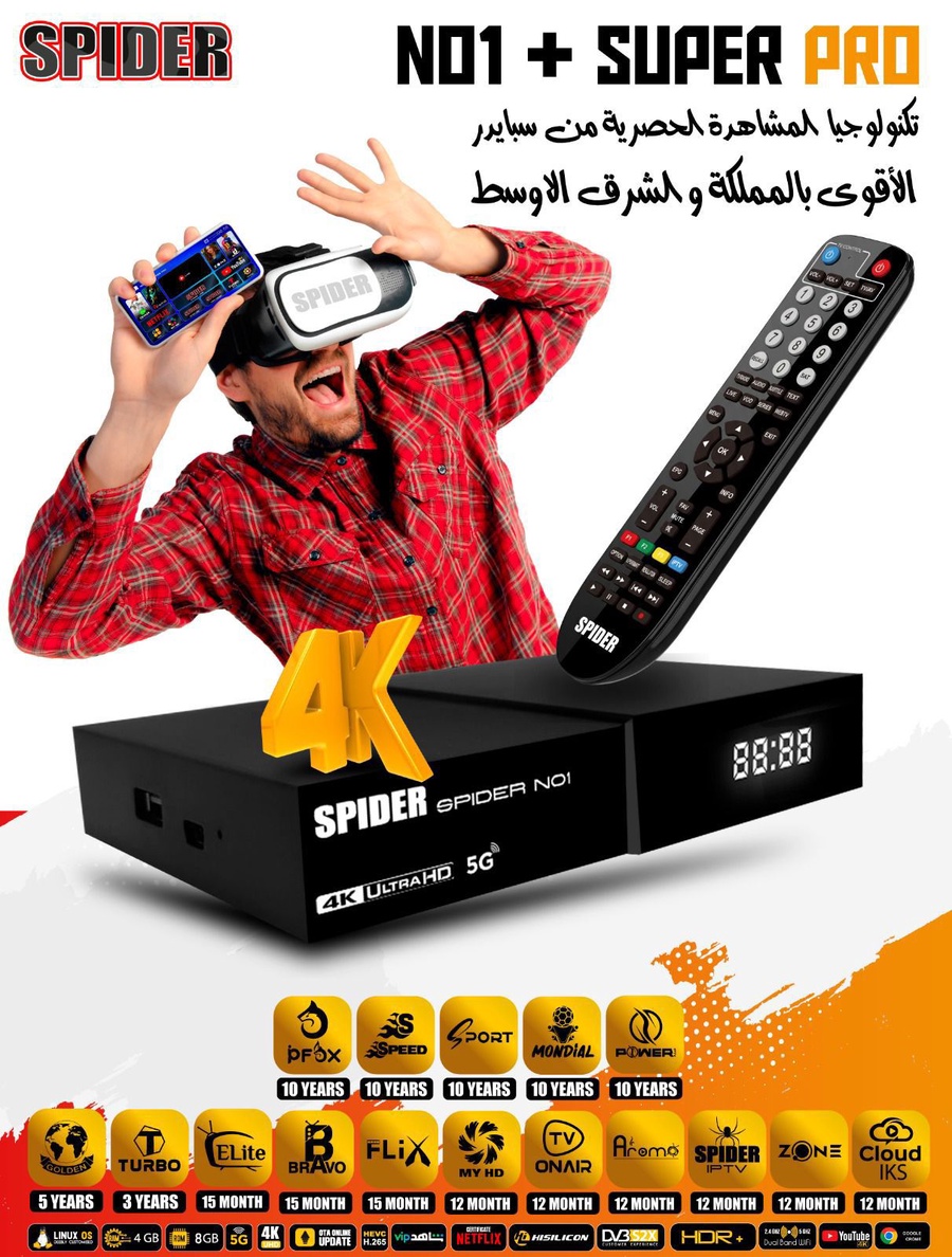 يتميز Spider NO1 Super Pro بمظهر أنيق وشاشة أمامية رقمية، مع دعم 5G وخصائص متعددة تجعله مناسباً لمن يريد أداء أسرع واستقراراً أفضل أثناء الاستخدام. كما يظهر من التصميم أنه موجّه للفئة التي تبحث عن رسيفر عملي وحديث مع خيارات مشاهدة متعددة وواجهة استخدام مريحة.