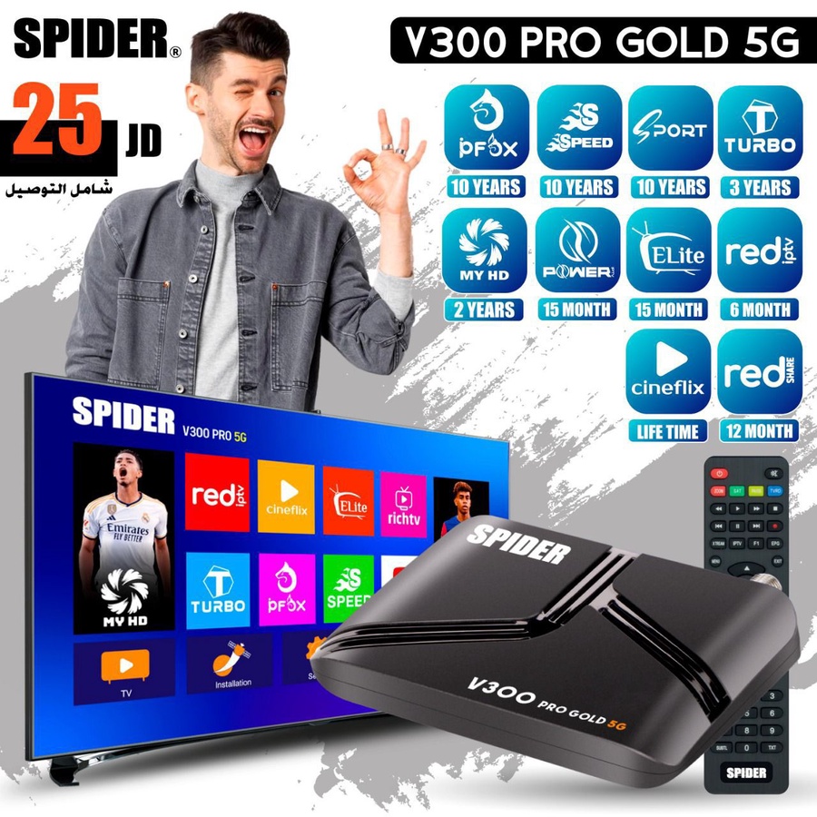 رسيفر Spider V300 Pro Gold 5G بسعر 25 دينار شامل التوصيل، مع اشتراكات متنوعة ومميزة، تصميم أنيق وأداء عملي لتجربة ترفيه منزلية ممتازة.