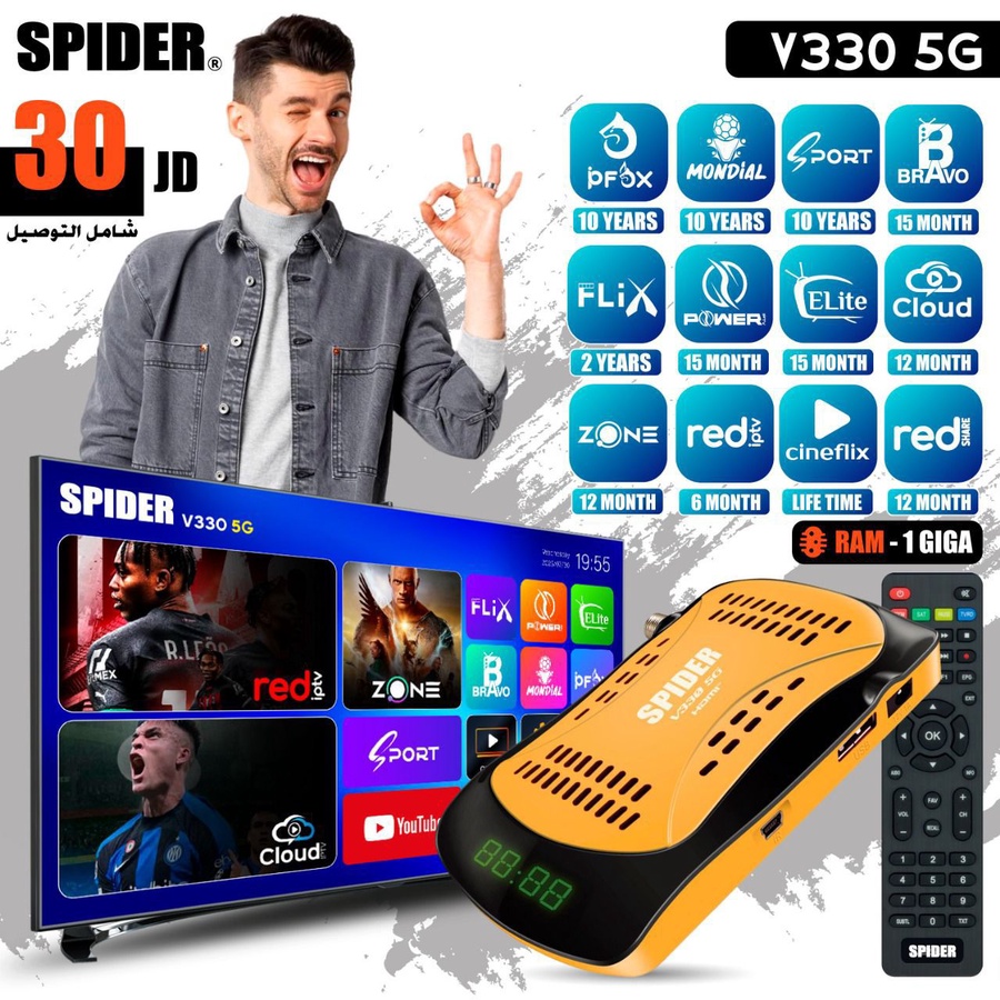 رسيفر Spider V330 5G بسعر 30 دينار شامل التوصيل، مع رام 1 جيجا واشتراكات متنوعة وقوية، تصميم عملي وأداء ممتاز لتجربة ترفيه منزلية متكاملة.