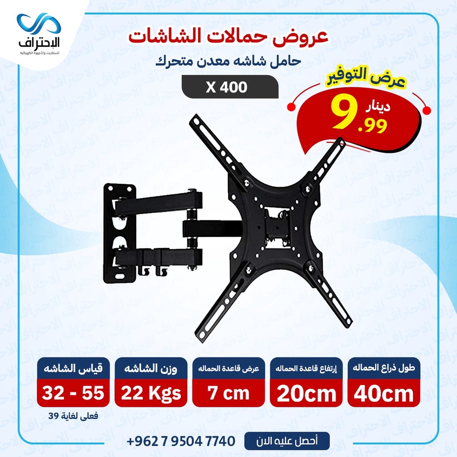 يدعم هذا الحامل الشاشات بمقاس 32 إلى 55 إنش، مع فعالية ممتازة حتى 39 إنش بحسب البيانات الظاهرة، ويتحمل وزن يصل إلى 22 كغم. كما يأتي بذراع بطول 40 سم، مع قاعدة تثبيت بارتفاع 20 سم وعرض 7 سم، ليكون مناسبًا لعدد كبير من الاستخدامات والمساحات.